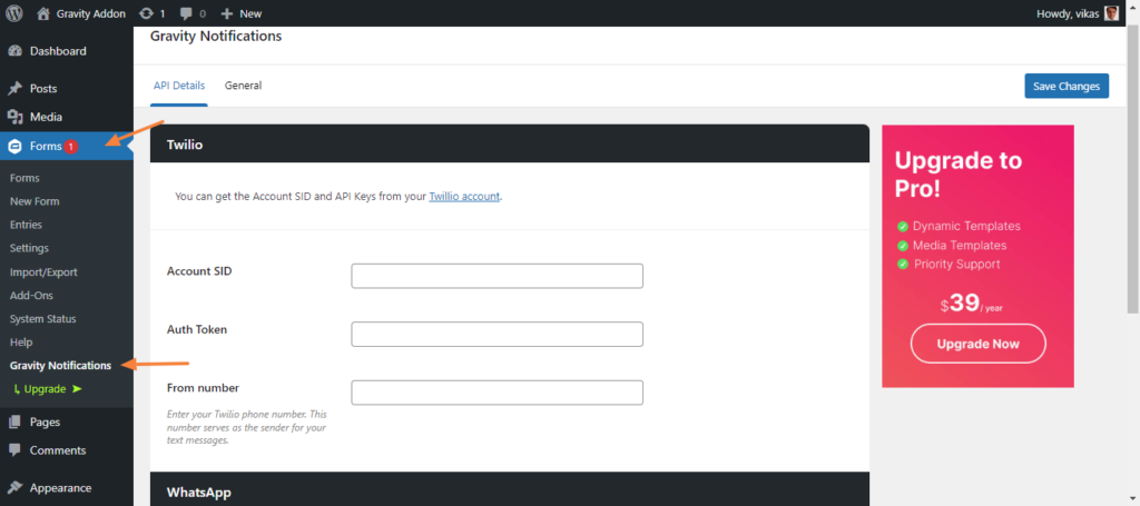 In order to use Gravity Notifications addon, you will need a Twilio account and Twilio API details. you can refer the Twilio API setup guide on how to add Twilio API details for Gravity notifications addon.
