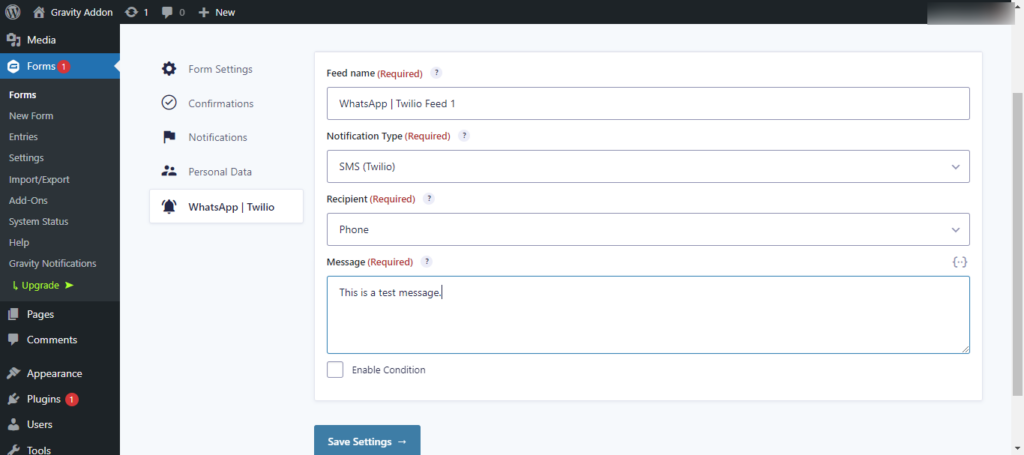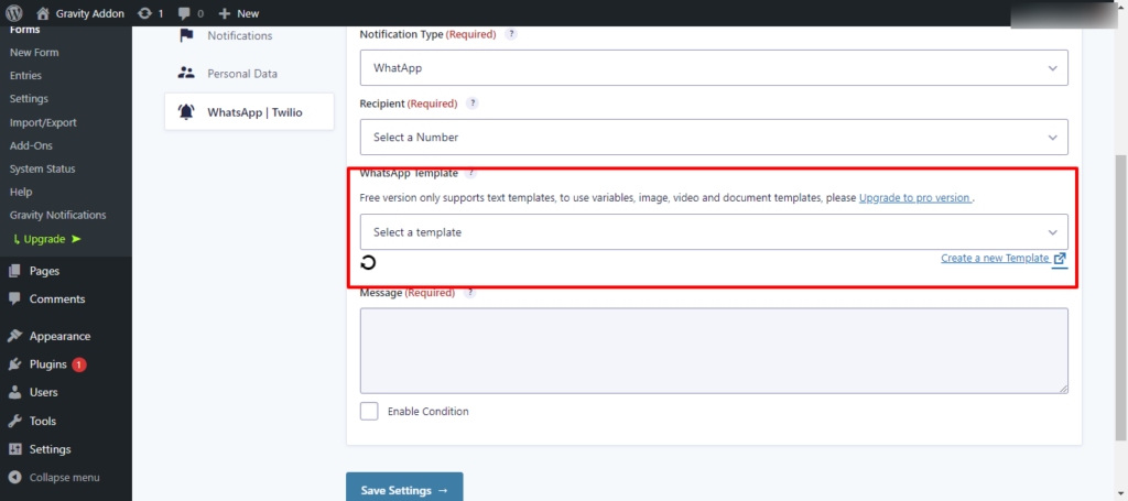 - Navigate to Forms > [Your Form] > Settings > WhatsApp | Twilio in the WordPress admin menu.