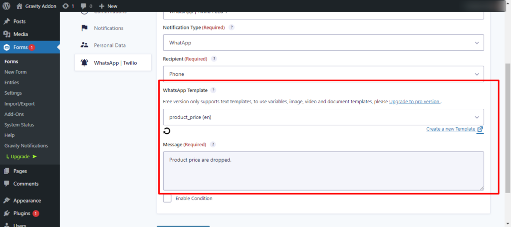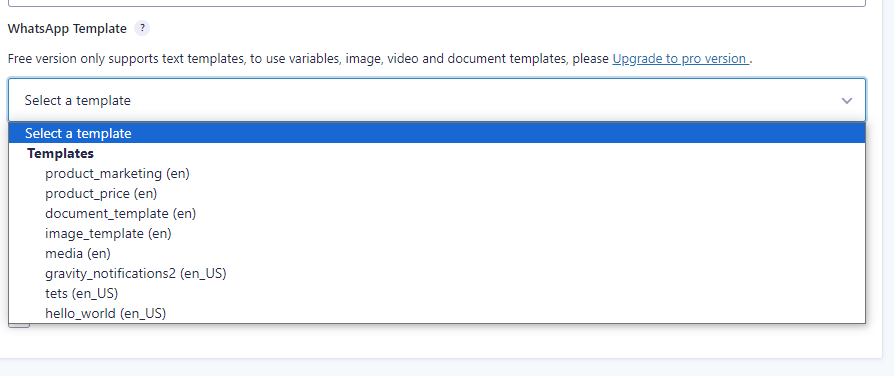 - Select the WhatsApp template , you want to send for this notifications. the lite version of gravity notifications addon only supports WhatsApp text templates, whereas the premium version supports all types of templates like text, variable and media templates.
