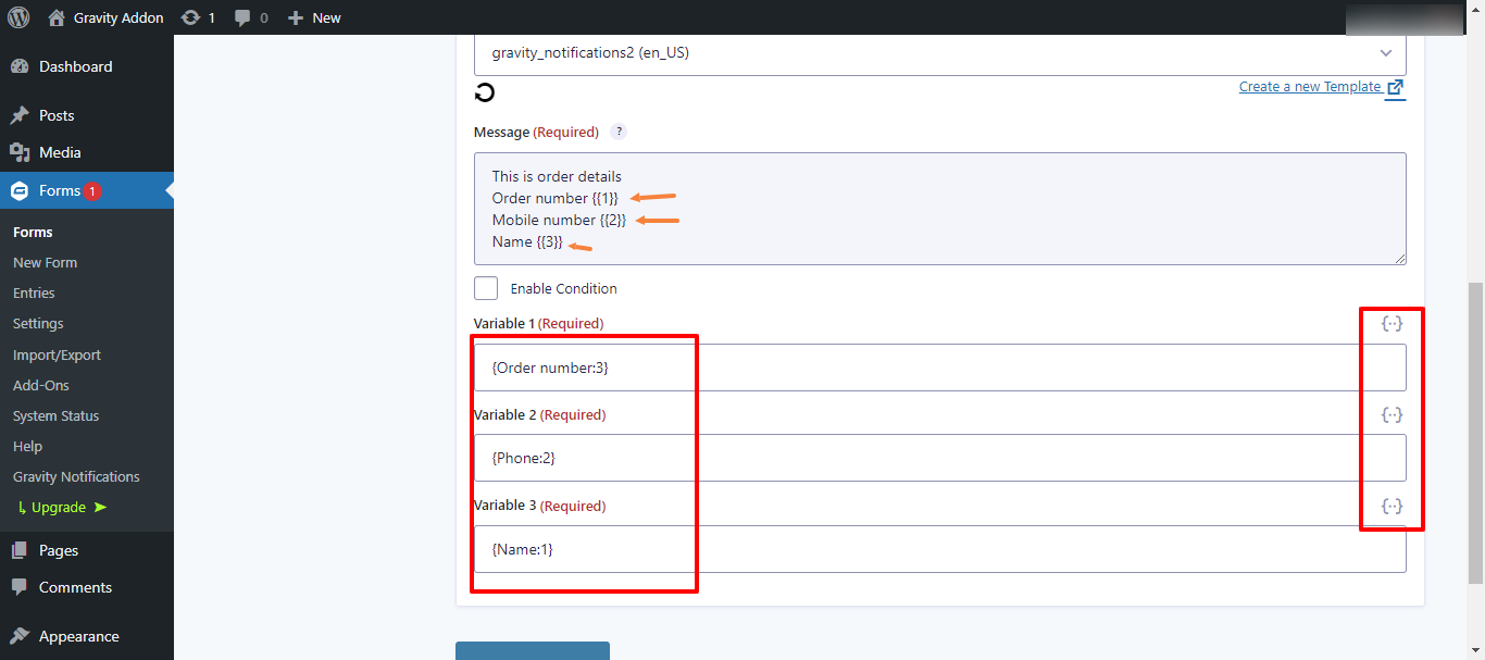 If you have done some changes in your WhatApp templates, please use the reload icon ( under WhatsApp template field) to sync the latest changes in gravity notifications addon.