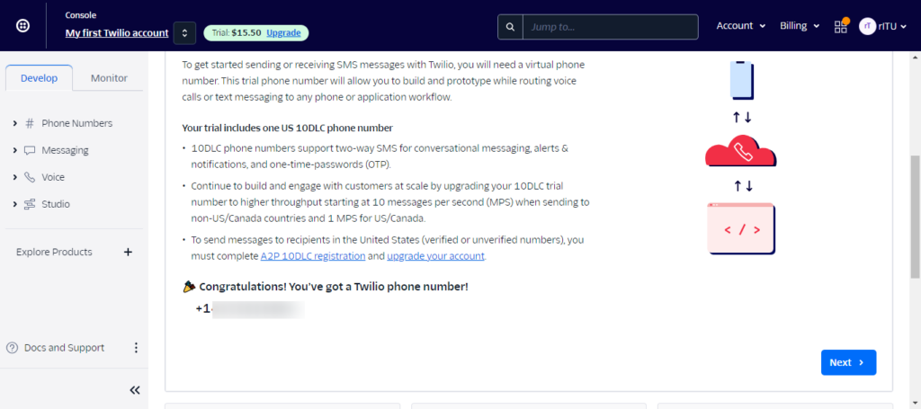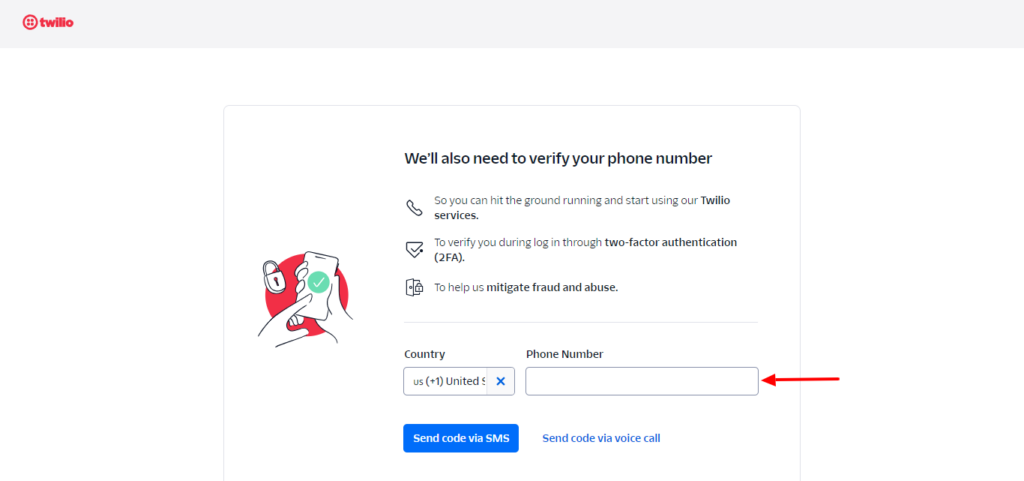 After signup, you will have to add the phone number to your Twilio account. please add the phone number you want to add it to Twilio account.
