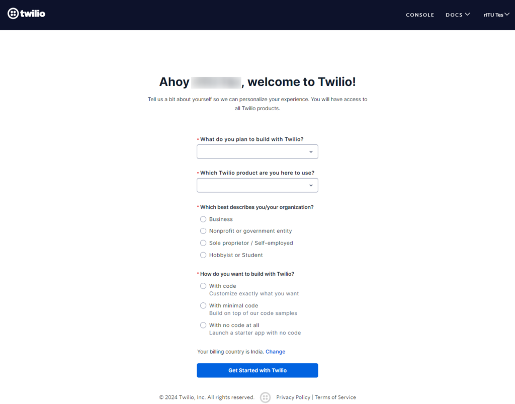 After this, you will be asked some basic questions about using Twilio, please fill up the form as per your usage. and click on Get Started with Twilio