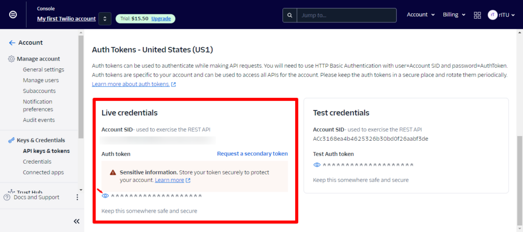 Go to Twilio dashboard -> Account ->API keys & tokens -> Live credentials